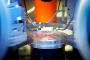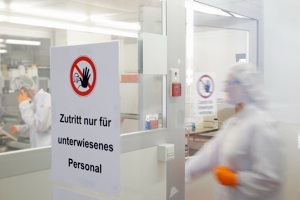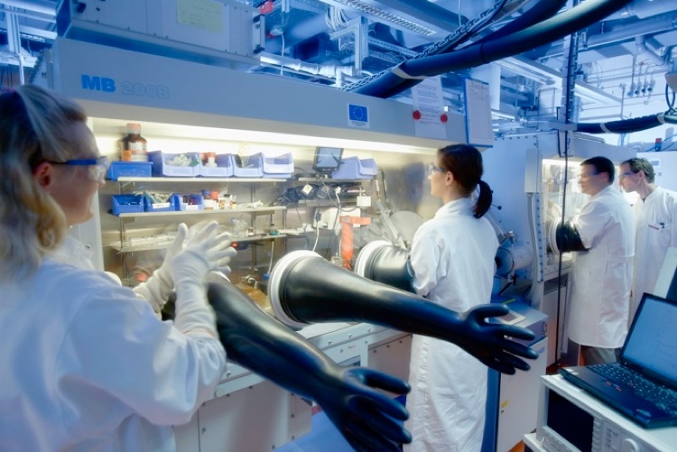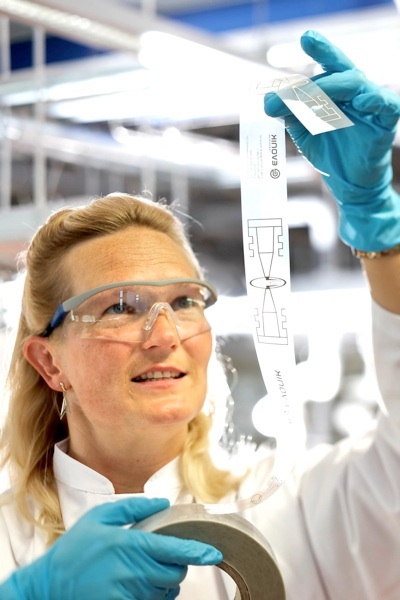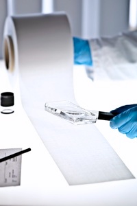 Das Science-to-Business Center „Nanotronics“ der Evonik Degussa GmbH vernetzt Forschung und Wissenschaft von den Grundlagen bis zur Pilotproduktion: Endkontrolle von Separion, einem Fleece mit keramischer Beschichtung, das als Separator für Lithium-Ionen Batterien genutzt wird.